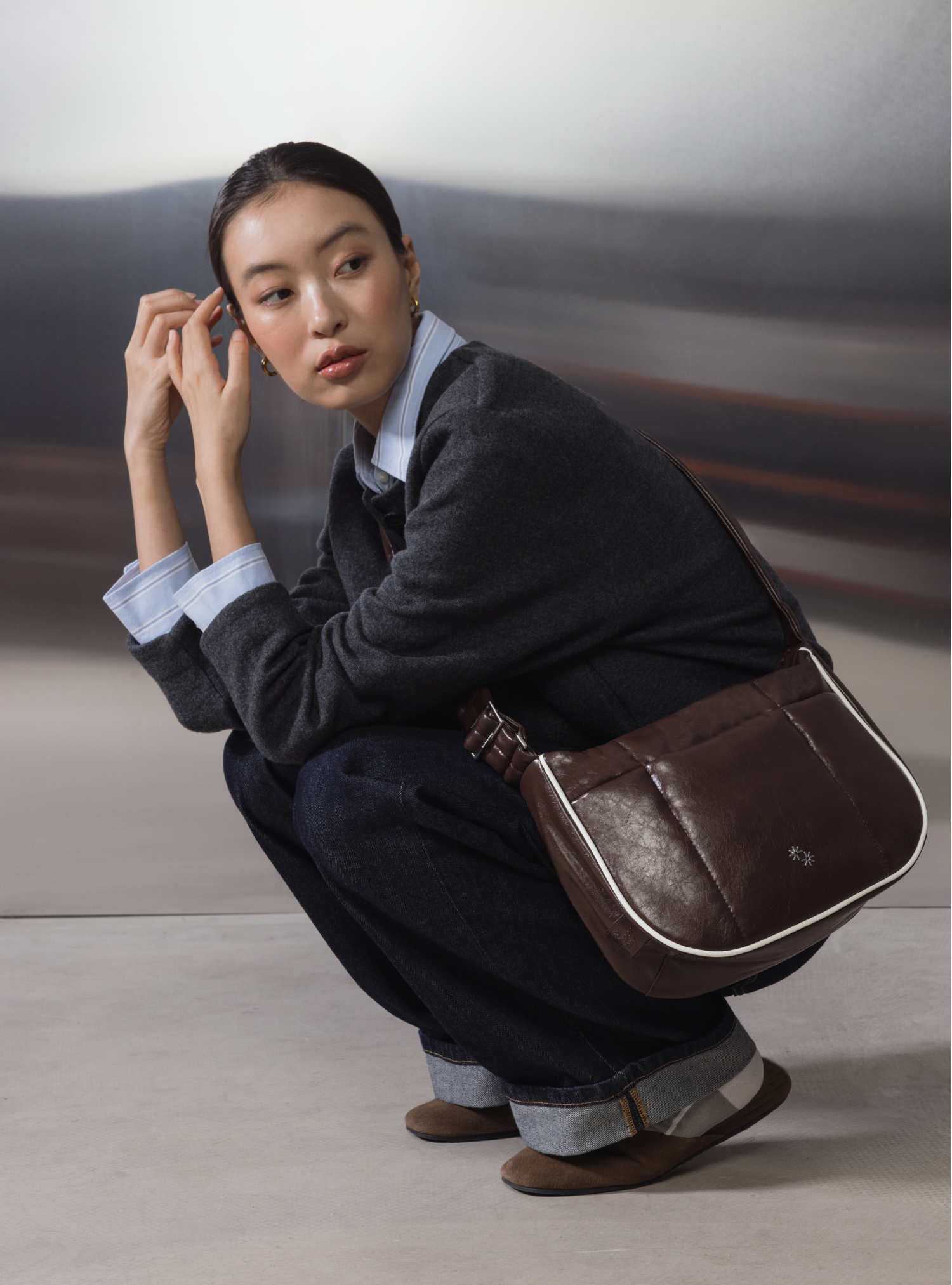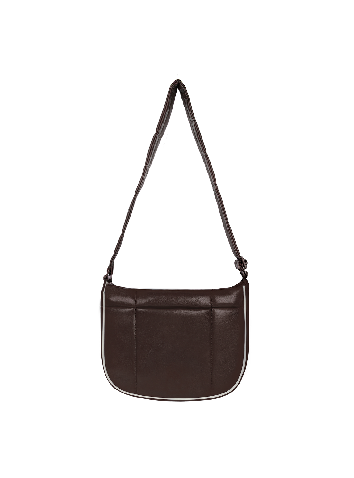 This Puffer Swing is an 80s-inspired shoulder bag made with vegan leather, outlined in cream vegan leather piping for a refined, structured finish. Fits your daily essentials (even a water bottle and iPad), with interior and exterior zip pockets.